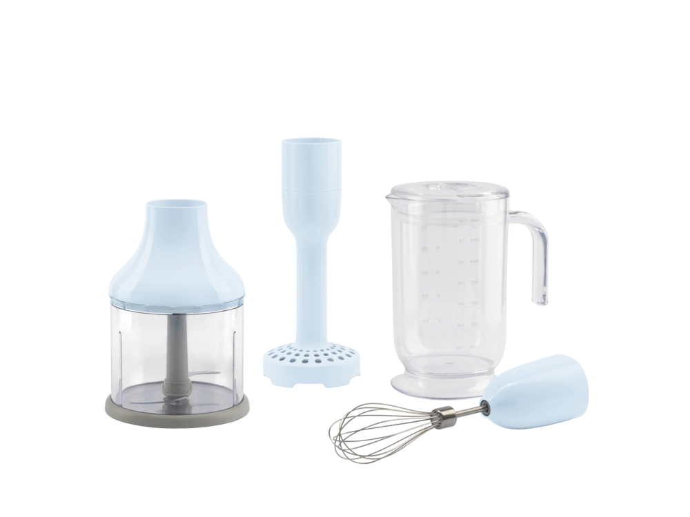 Zestaw 4 akcesoriów, pastelowy błękit, kielich do blendowania, rozdrabniacz, końcówka do ubijania, ramię do rozgniatania