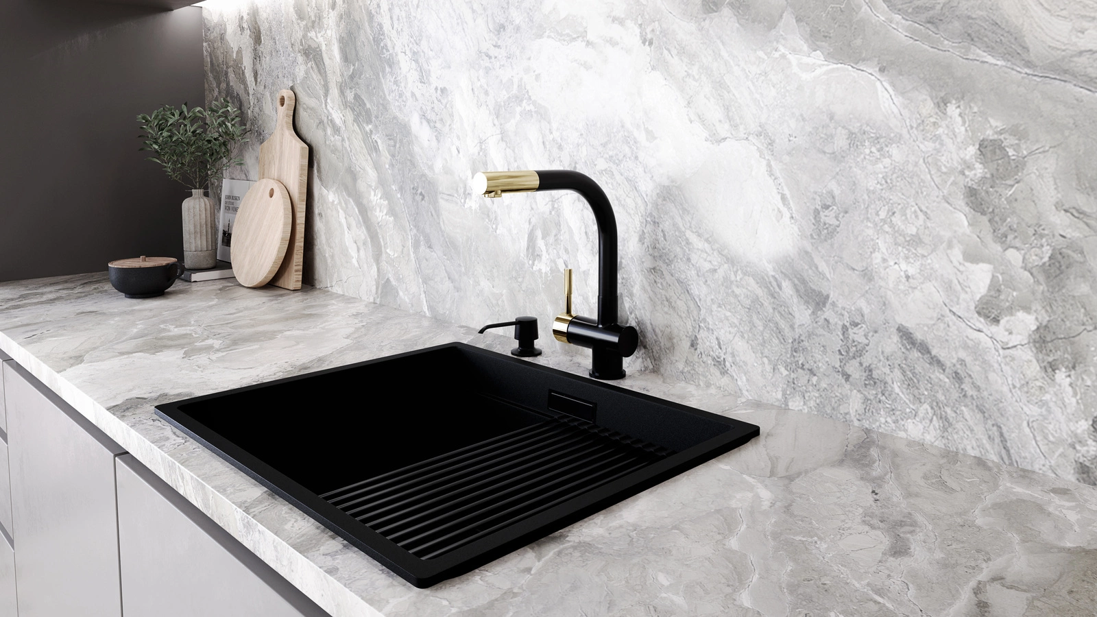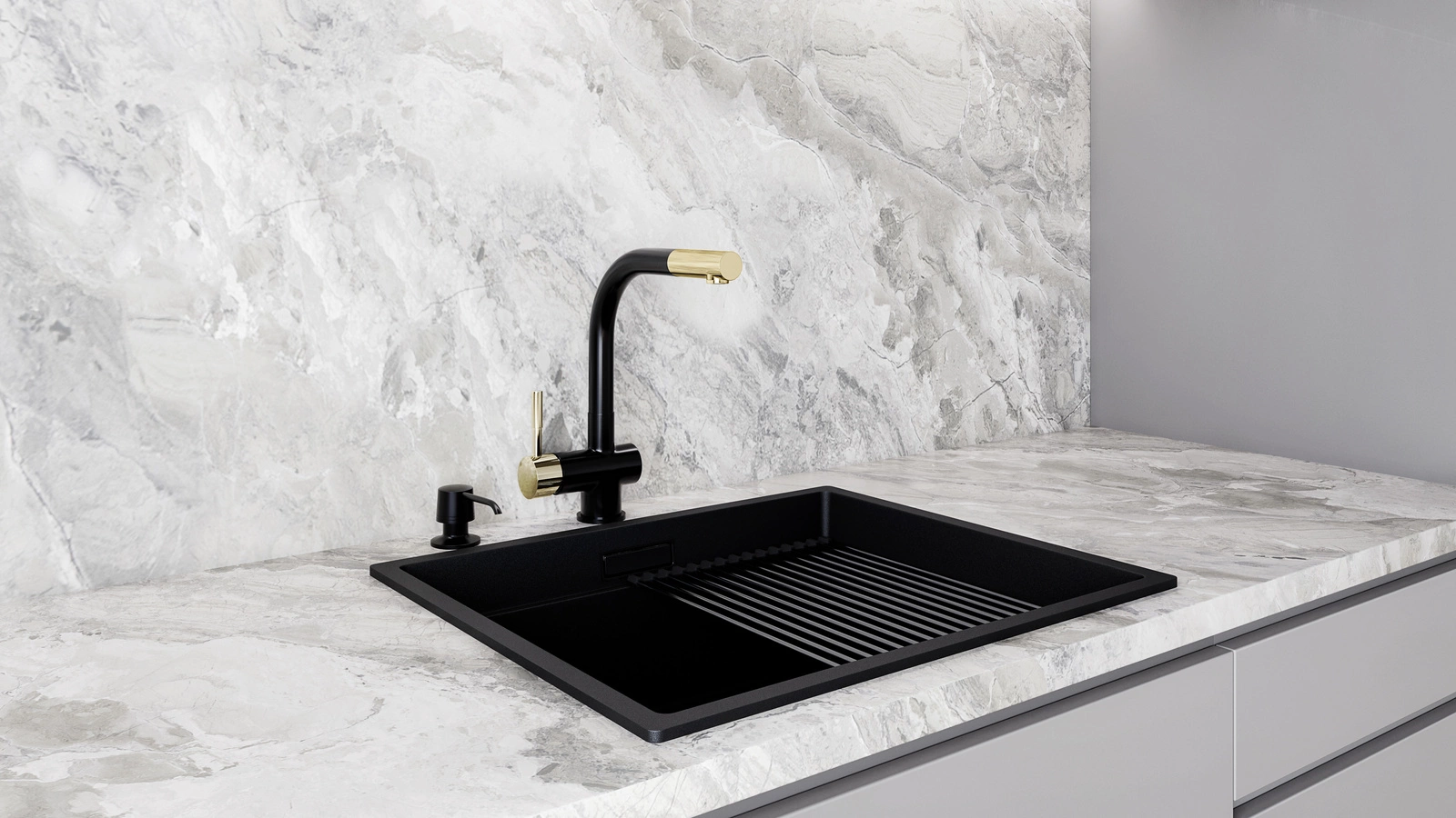 Dodaj swojej kuchni wyjątkowego blasku dzięki przemyślanym detalom baterii Lobio Black/Light Gold Ring. Złota końcówka wylewki nie tylko podkreśla elegancję i unikalny styl tego produktu, ale także zapewnia trwałość i odporność na codzienne użytkowanie. Uchwyt do regulacji wody, również wykończony złotą powłoką, oferuje precyzyjną kontrolę nad temperaturą i siłą strumienia, łącząc w sobie funkcjonalność z niepowtarzalnym designem. Te złote akcenty są nie tylko praktyczne, ale także stanowią wyrafinowaną ozdobę, która wyróżni Twoją kuchnię na tle innych. Wybierając baterię Lobio, decydujesz się na produkt, w którym każdy detal został zaprojektowany z myślą o zadowoleniu użytkownika i estetyce przestrzeni.Zalety i korzyści dla użytkownika