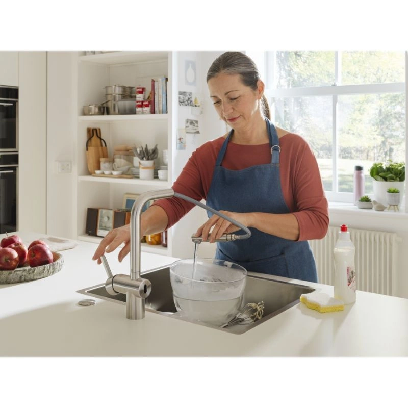 Koniec z gimnastyką przy zmywaniu naczyń! Wyciągana wylewka zapewnia niezrównaną swobodę ruchów, ułatwiając mycie naczyń o różnych kształtach i wielkościach. Napełnianie garnków i czajników wodą również staje się dziecinnie proste. Wyciągana wylewka zwiększa również funkcjonalność zlewozmywaka, pozwalając na komfortowe mycie owoców i warzyw.