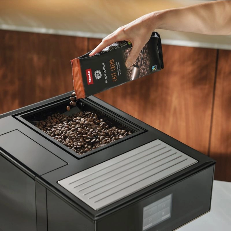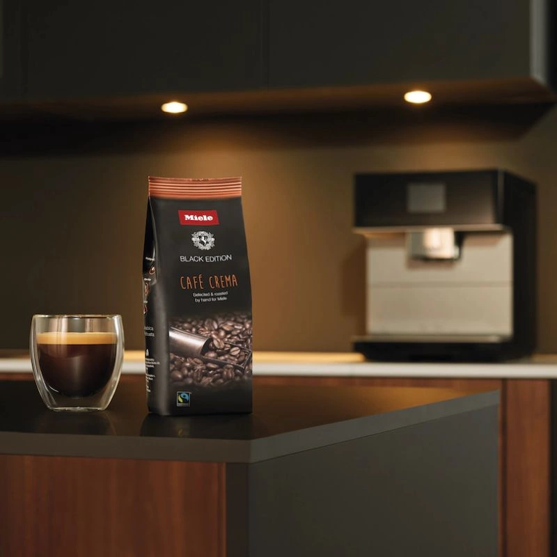Delikatnie palona kawa ziarnista MIELE Black Edition BIO CAFÉ CREMA to gwarancja wyśmienitego smaku i aromatu w każdej filiżance. Idealnie sprawdzi się zarówno w ekspresach ciśnieniowych wolnostojących, jak i ekspresach do zabudowy, oferując bogatą cremę i pełnię smaku.