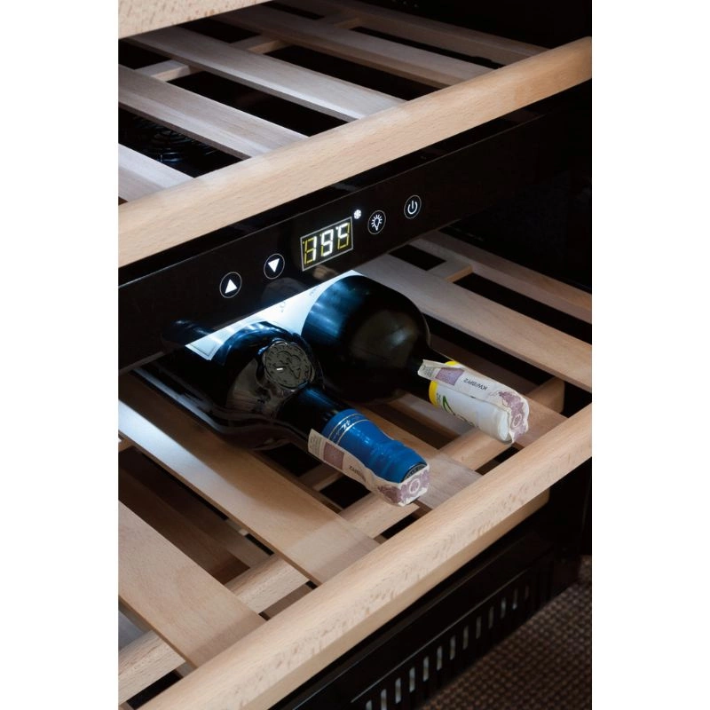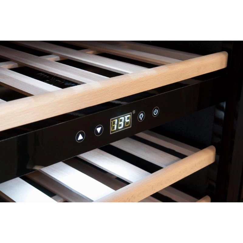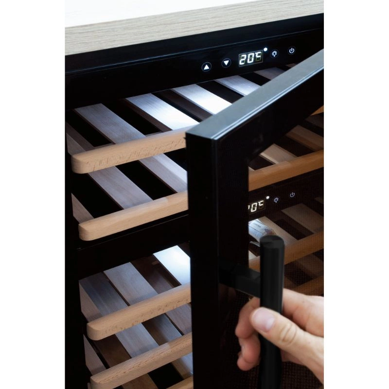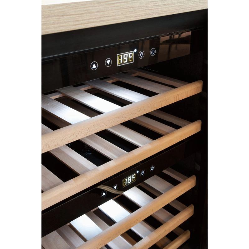 Dwustrefowa regulacja temperatury: Stwórz idealny klimat dla różnych rodzajów wina dzięki dwóm niezależnym strefom temperatury. Górna strefa pozwala na ustawienie temperatury w zakresie od 5°C do 10°C, idealnej do przechowywania białych win i różowych, a dolna strefa zapewnia optymalne warunki do przechowywania czerwonych win w temperaturze od 10°C do 20°C. Dzięki temu możesz przechowywać w swojej kolekcji zarówno delikatne Chardonnay, jak i wyraziste Cabernet Sauvignon, mając pewność, że każde z nich zachowa swój wyjątkowy smak i aromat.