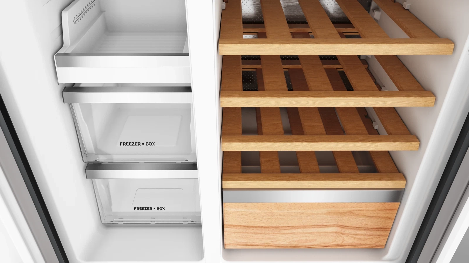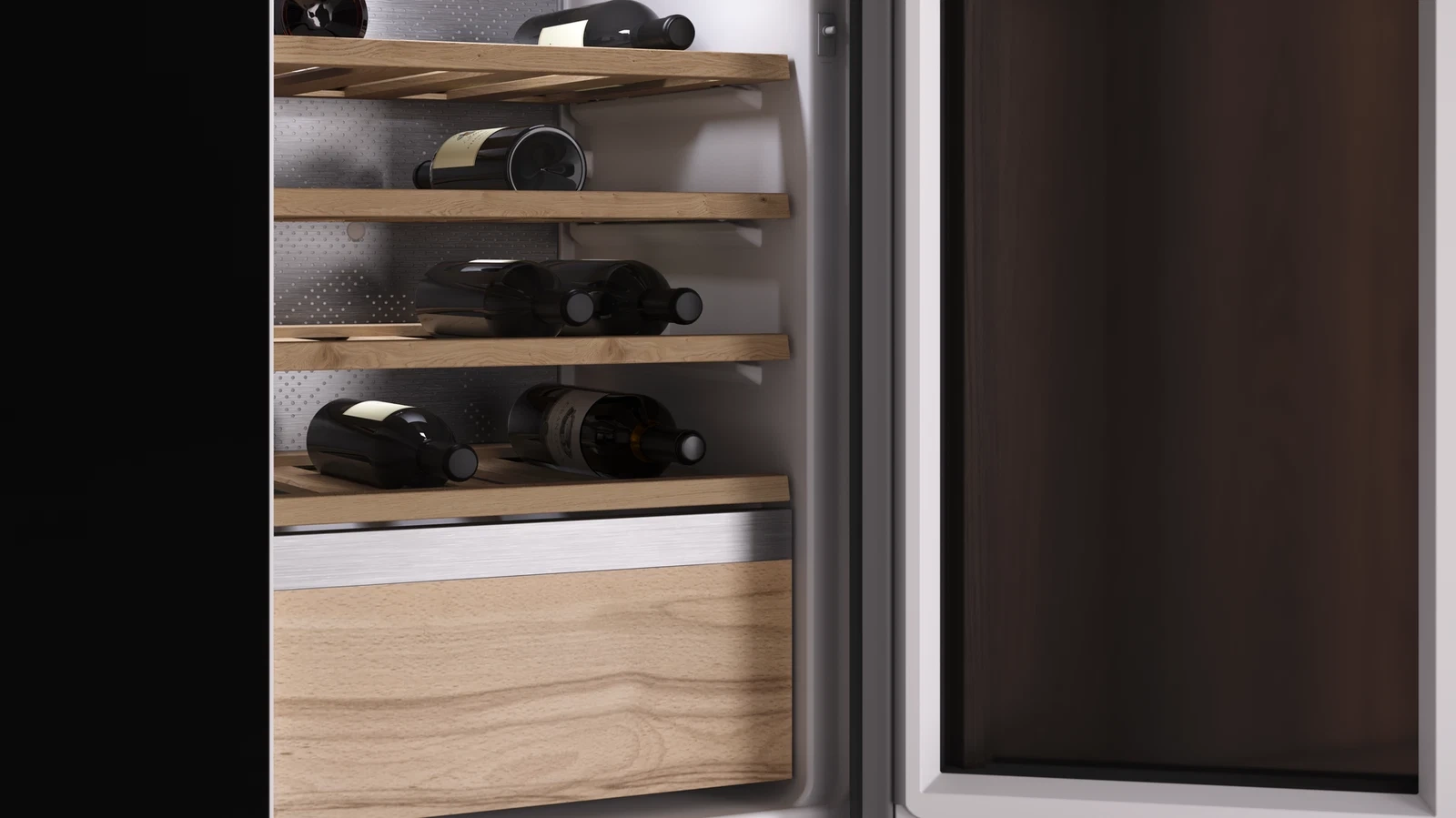 Modułowy system półek umożliwia dowolną konfigurację przestrzeni, dostosowując ją do różnych formatów butelek - od smukłych Bordeaux po potężne Magnum