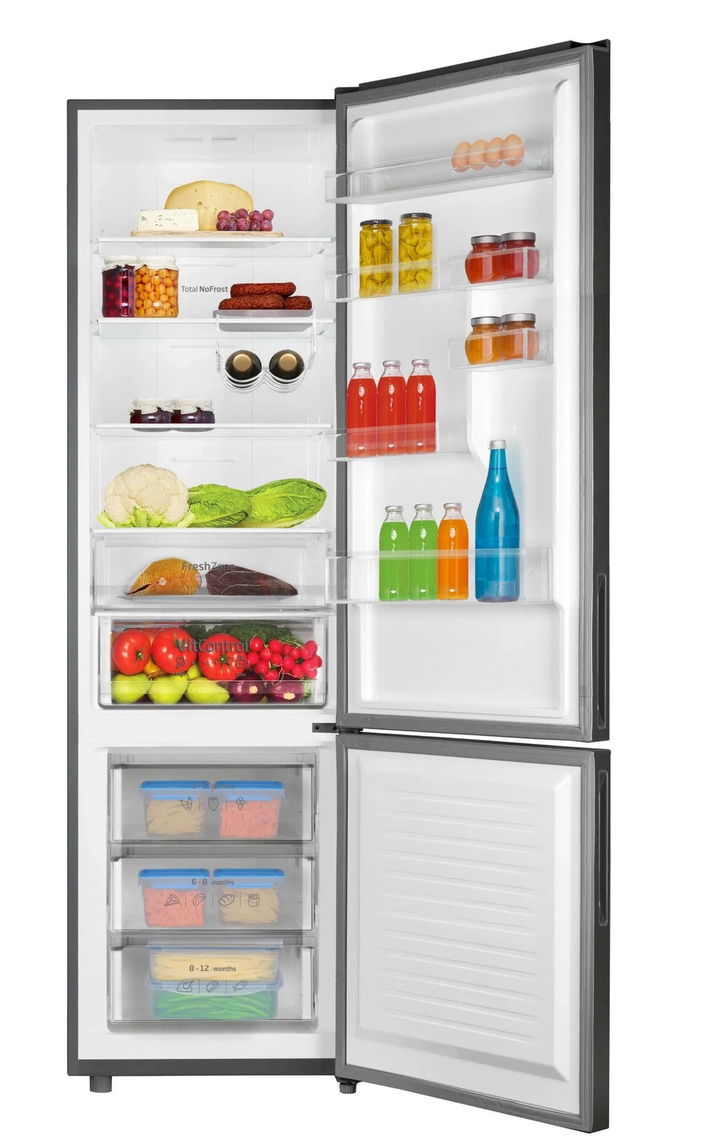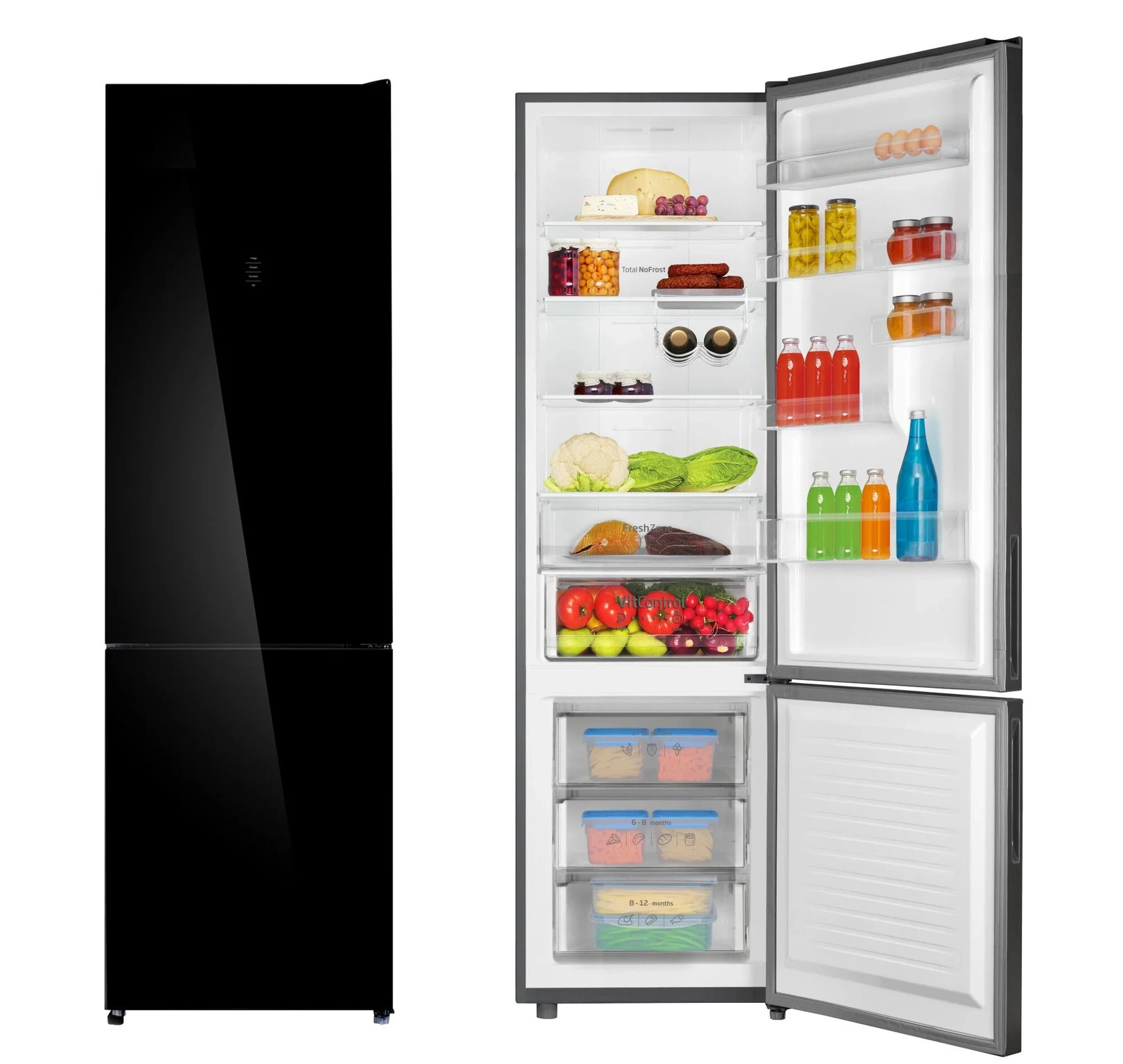 Lodówka AMICA FK3356.4 oferuje dużą pojemność całkowitą, co pozwala na wygodne przechowywanie większych ilości żywności. Adjustable Door Bins, półki z hartowanego szkła i specjalne komory FreshZone ułatwiają dostęp do produktów oraz umożliwiają organizację przestrzeni według własnych preferencji.
