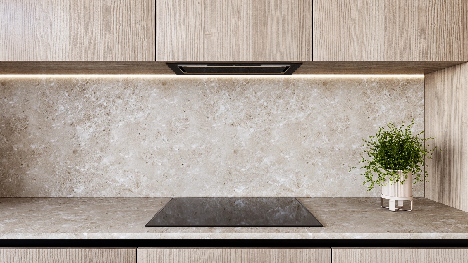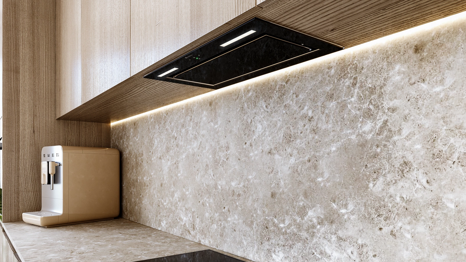Zintegrowane oświetlenie w formie pasków LED doskonale oświetlają miejsce pracy. Możliwość regulacji barwy światła (2900K – 6300K) oraz jego natężenia pozwala dopasować oświetlenie do reszty kuchni i nastroju otoczenia. To nie tylko funkcjonalność, ale także estetyka, która nadaje kuchni nowoczesny charakter.