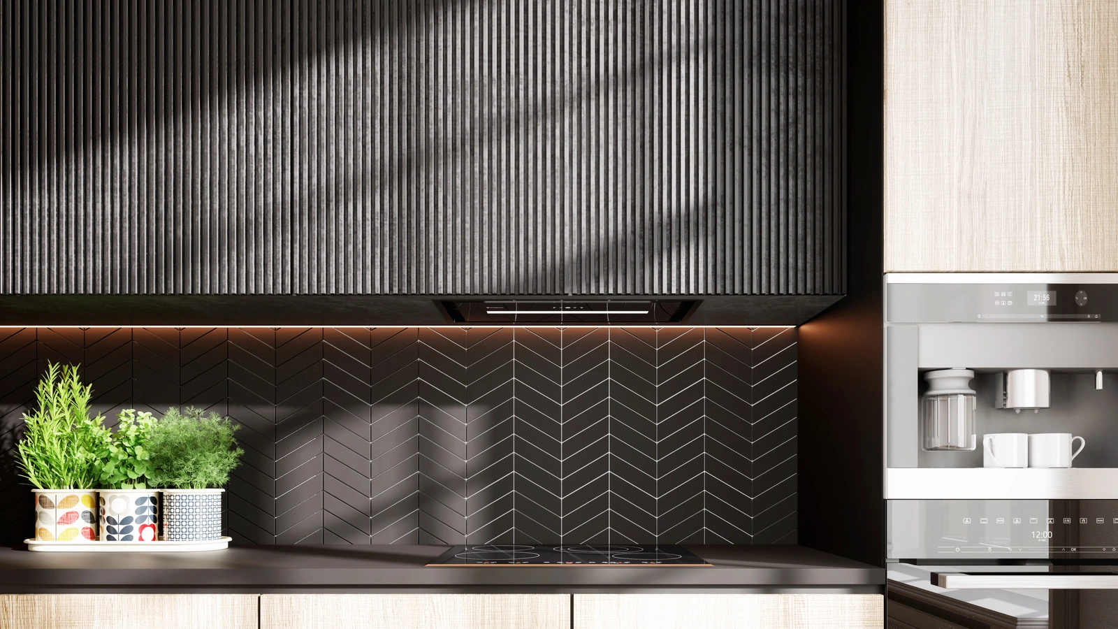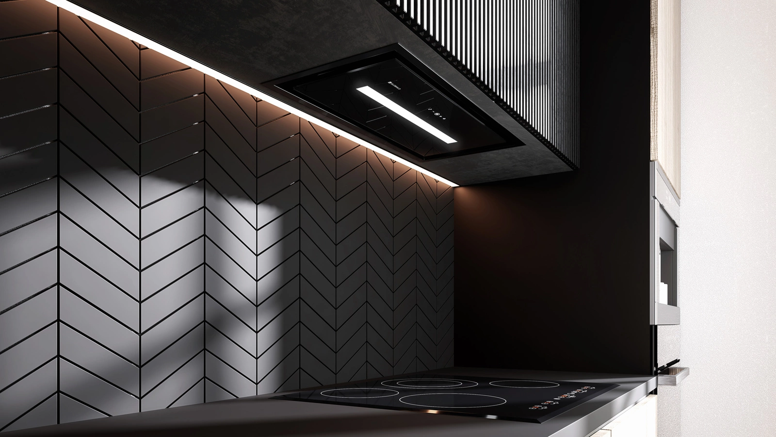 • Kompaktowy korpus o wysokości tylko 14,2 cm. pozwala na łatwe ukrycie okapu w kuchennej zabudowie i oszczędność miejsca.