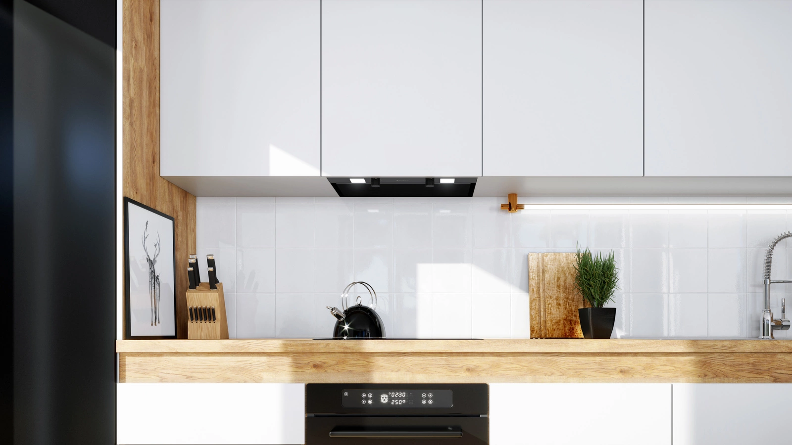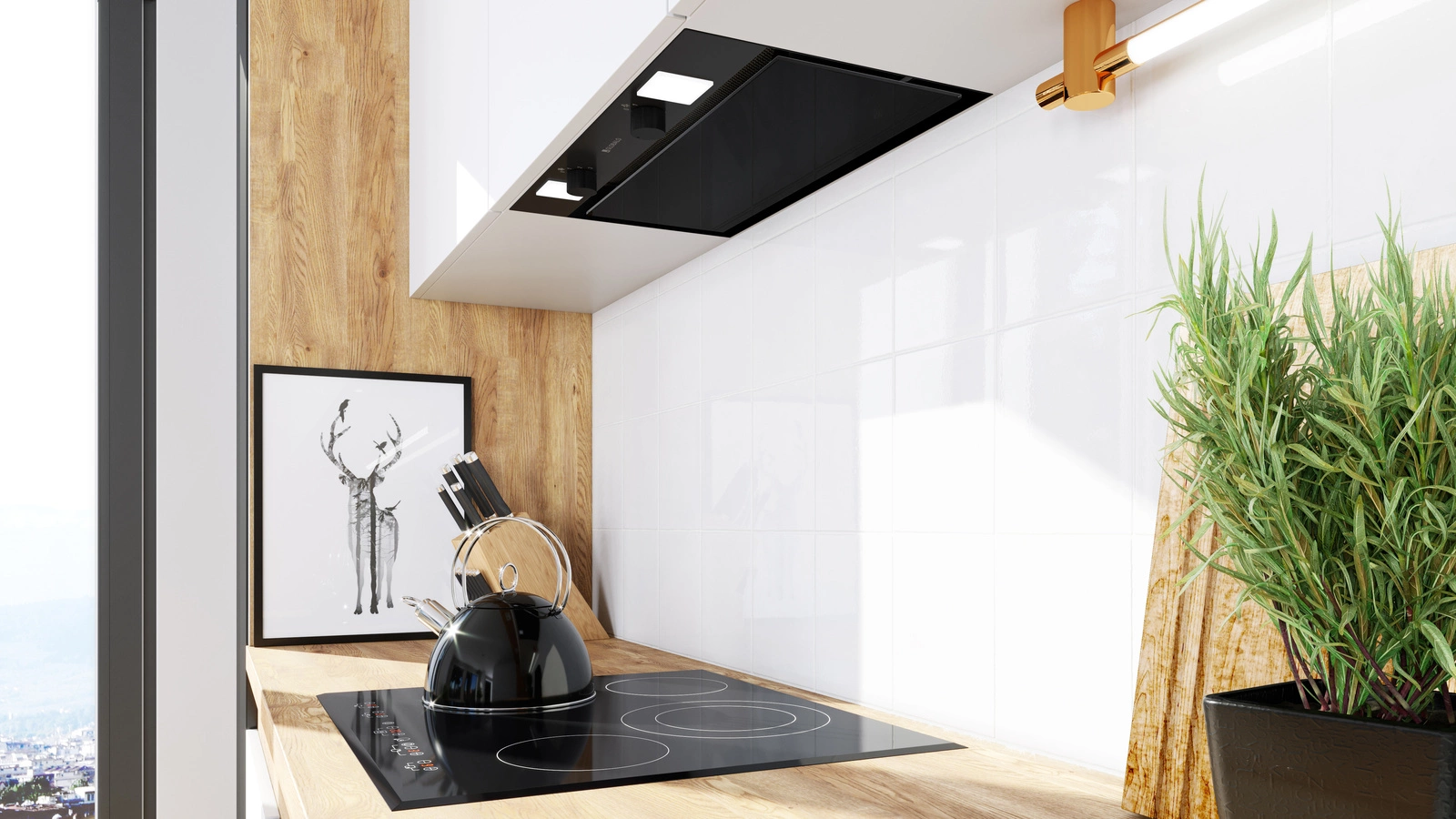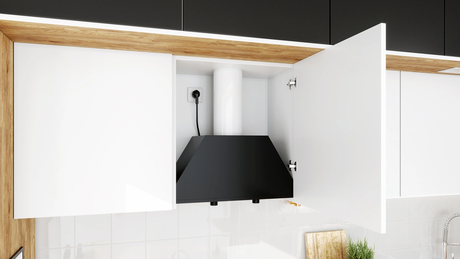 - Schowany w szafce okap jest cichy (45 dB na pierwszym biegu), a więc nie powoduje dyskomfortu wśród osób przebywających w kuchni.