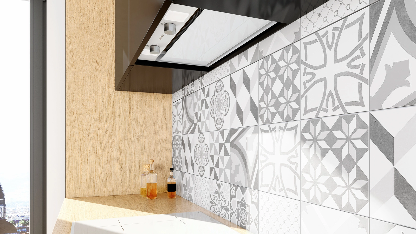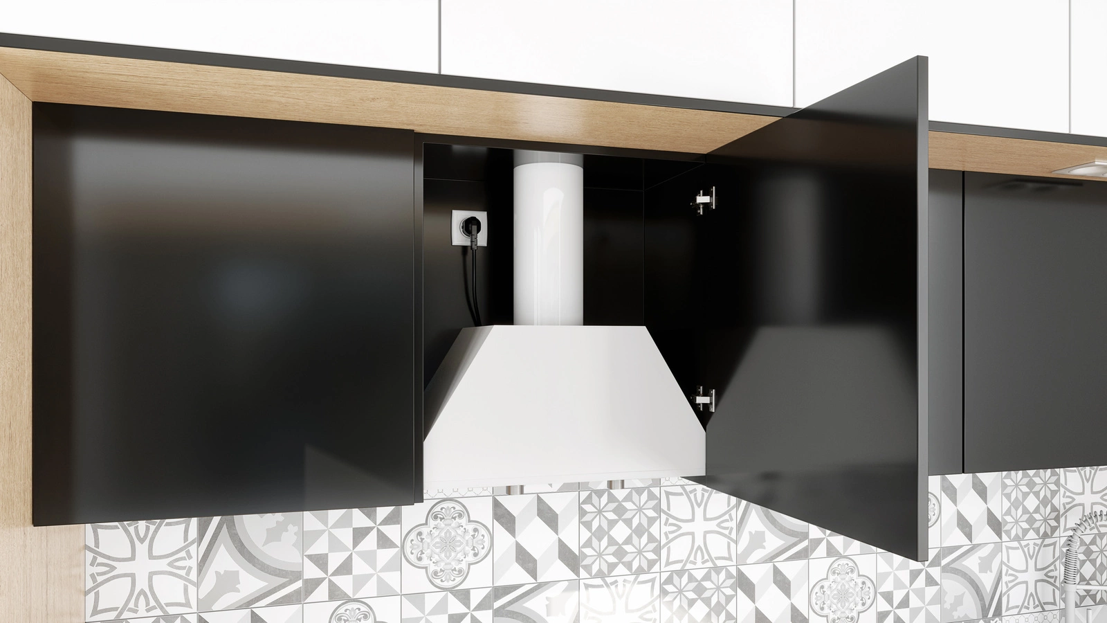 - Schowany w szafce okap jest cichy (45 dB na pierwszym biegu), a więc nie powoduje dyskomfortu wśród osób przebywających w kuchni.
