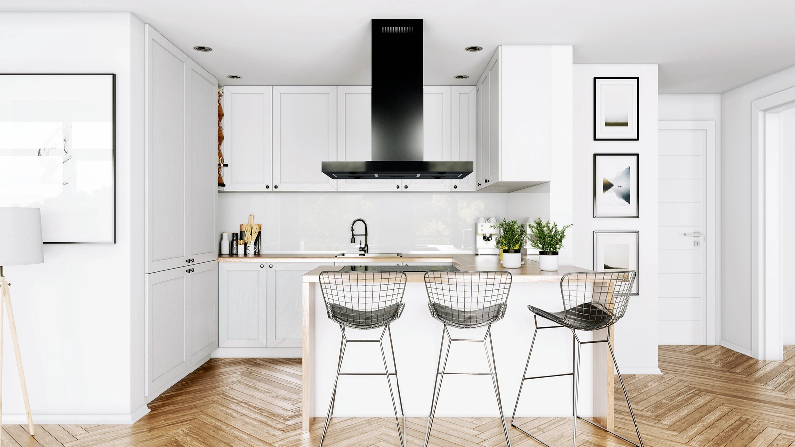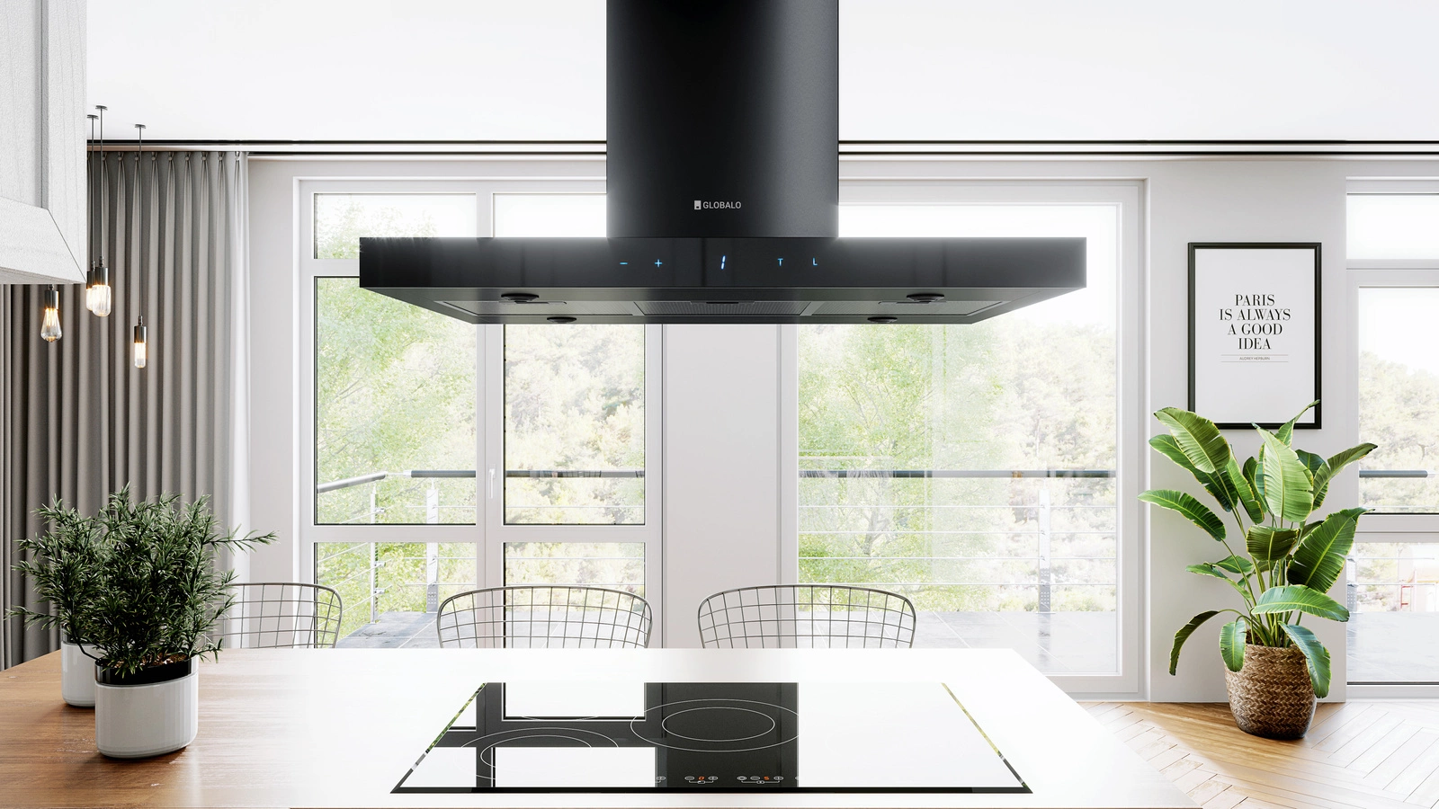 Ten klasyczny design okapu kuchennego Verta Isola 90.3 H2H Black sprawdzi się w jasnych, przestronnych wnętrzach – nad kuchenną wyspą.
