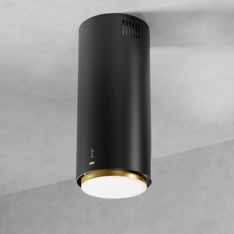 Berg Floyd Premium Gold Isola to okap wyspowy o szerokości 90 cm, wykonany z najwyższej jakości lakierowanej stali nierdzewnej w kolorze czarnym ze złotym elementem dekoracyjnym. Precyzyjne wykończenie i dbałość o detale sprawiają, że okap ten staje się prawdziwym dziełem sztuki użytkowej. Nowoczesny design okapu idealnie pasuje do wnętrz kuchennych w stylu nowoczesnym, glamour i industrialnym, dodając im elegancji i charakteru.