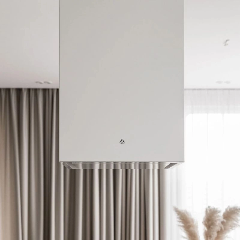 Ten minimalistyczny okap wyspowy Ciarko w kształcie sześcianu został wykonany z wysokiej jakości materiałów i z dbałością o każdy detal. Wydajny silnik o mocy 680 m³/h błyskawicznie usuwa zanieczyszczenia i zapewnia czyste powietrze w kuchni. Poziom hałasu okapu wynosi zaledwie 40 dB na najniższym biegu, co zapewnia komfortowe użytkowanie.
