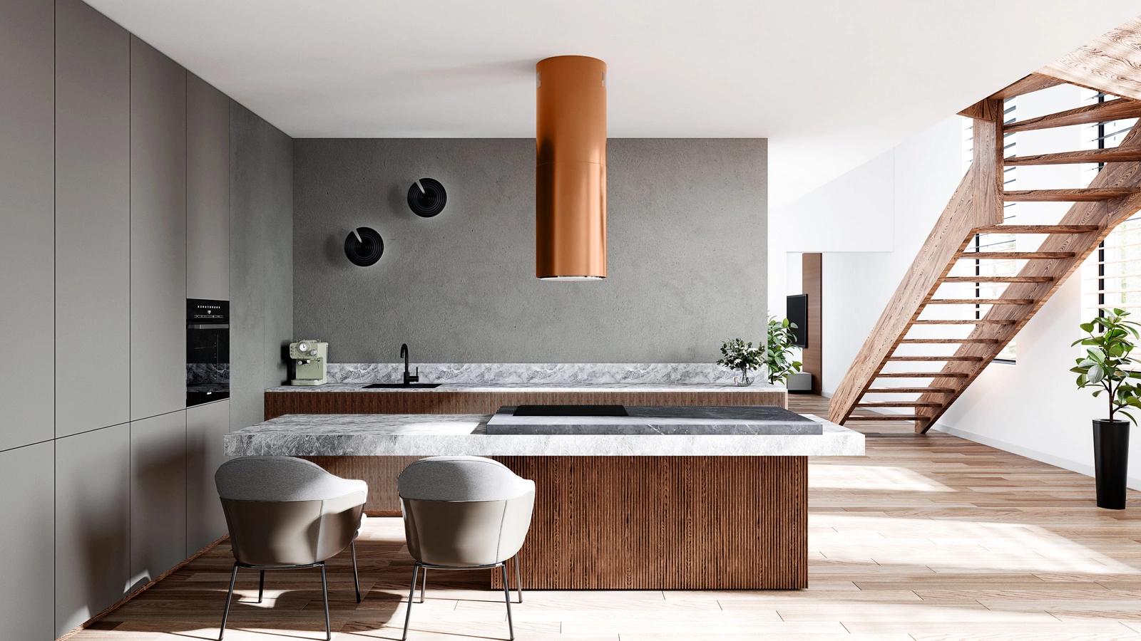 Cylindryczny okap wyspowy to efektowne urządzenie, dzięki któremu wyspa kuchenna będzie nie tylko ozdobą pomieszczenia, ale również komfortową powierzchnią roboczą, znakomicie przystosowaną do przygotowywania posiłków.