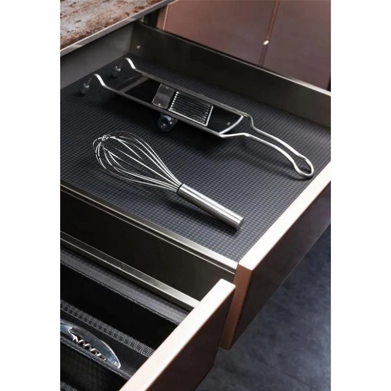 Przede wszystkim ze względu na jej wytrzymałość i skuteczność. Struktura powierzchni gwarantuje, że wszystkie przedmioty pozostaną na swoim miejscu, nawet gdy szuflada jest otwierana i zamykana. Mata idealnie przylega do dna mebla, dzięki czemu jest niewidoczna, a jednocześnie spełnia swoją funkcję ochrony. Ponadto, jej czarna kolorystyka dodaje elegancji i estetyki Twojej kuchni.