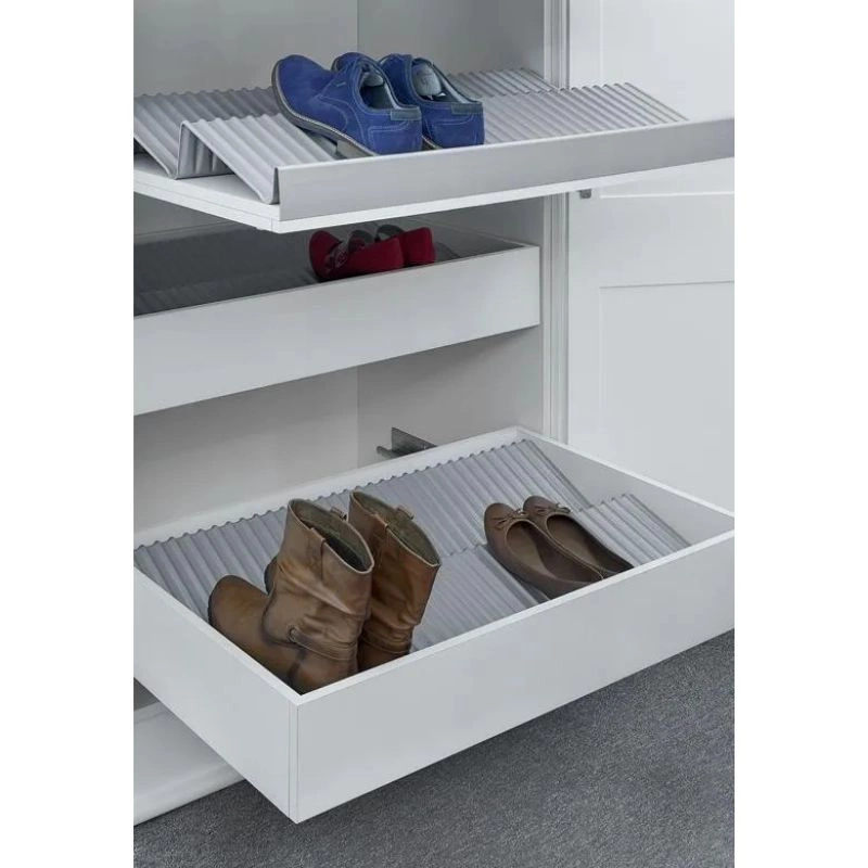 Różne opcje montażu: Nasz organizer na buty można zastosować na kilka różnych sposobów. Możesz umieścić go na dnie gotowej szuflady, co sprawi, że Twoje buty będą uporządkowane i łatwo dostępne. Alternatywnie, możesz użyć go jako samodzielnej półki, nakładanej na płytę wysuwaną na prowadnicy. Dzięki specjalnemu kształtowi, płyta podtrzymująca pozostaje ukryta, nadając Twojej szafie schludny wygląd.