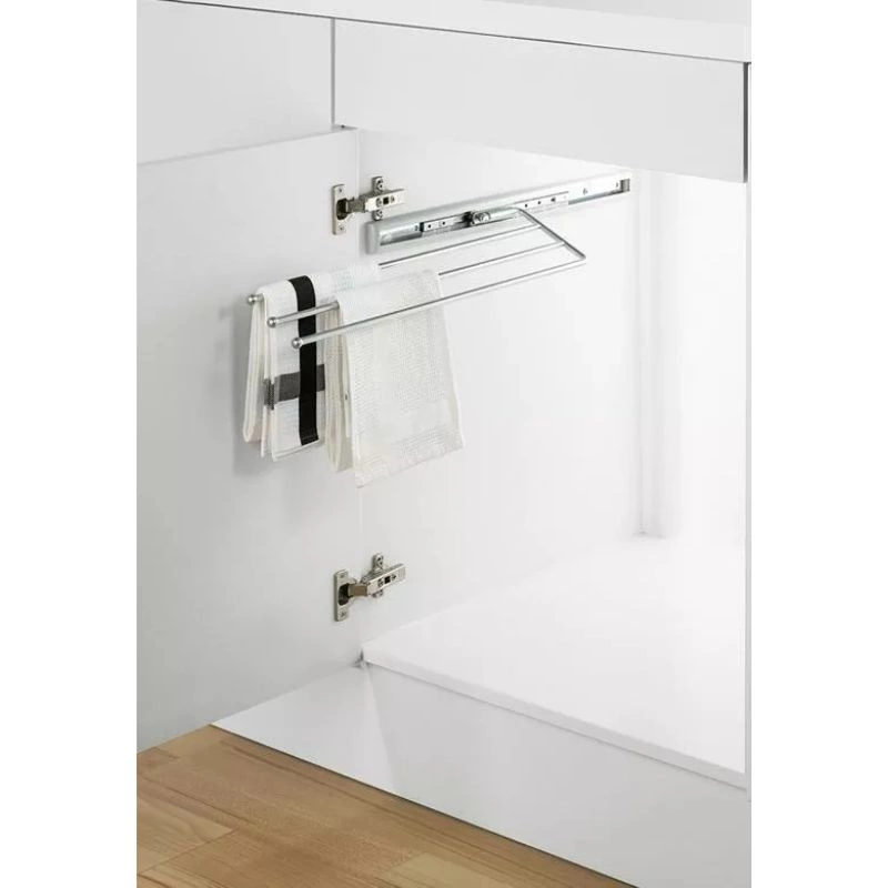 Niezwykle przydatną cechą tego wieszaka jest możliwość regulacji nachylenia wysuwanej części. Dzięki tej funkcji możesz dostosować wieszak do swoich potrzeb, umieszczając go na przykład w szafce lub za ukrytą ścianką, aby wilgotne ręczniki czy ścierki mogły swobodnie schnąć.