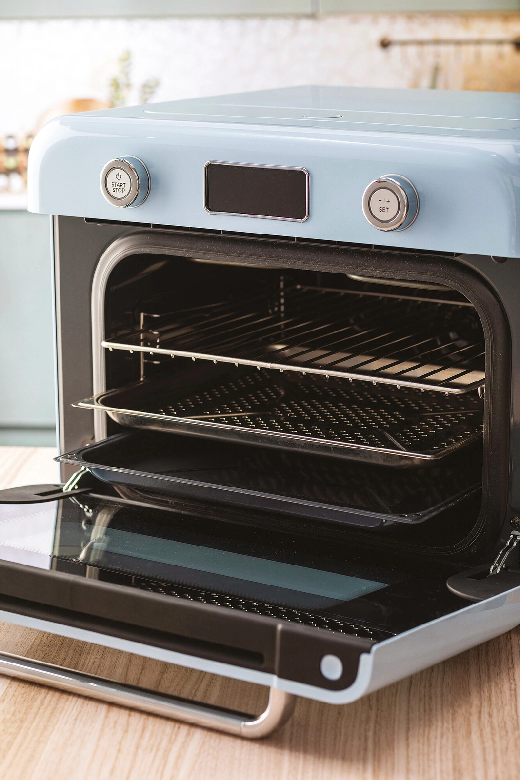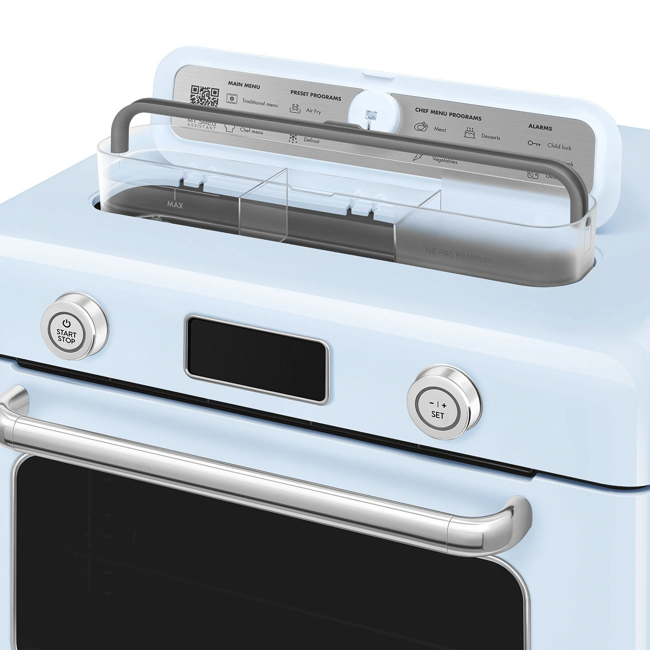 Design piekarnika COF01PBEU to połączenie stylu retro z nowoczesnością, charakterystyczne dla marki Smeg. Stylowy czarny front z detalami ze stali nierdzewnej sprawia, że urządzenie stanie się eleganckim i funkcjonalnym elementem każdej kuchni. Kompaktowe wymiary oraz możliwość zabudowy nablatowej pozwalają na wygodne dopasowanie piekarnika do różnych rodzajów mebli kuchennych.