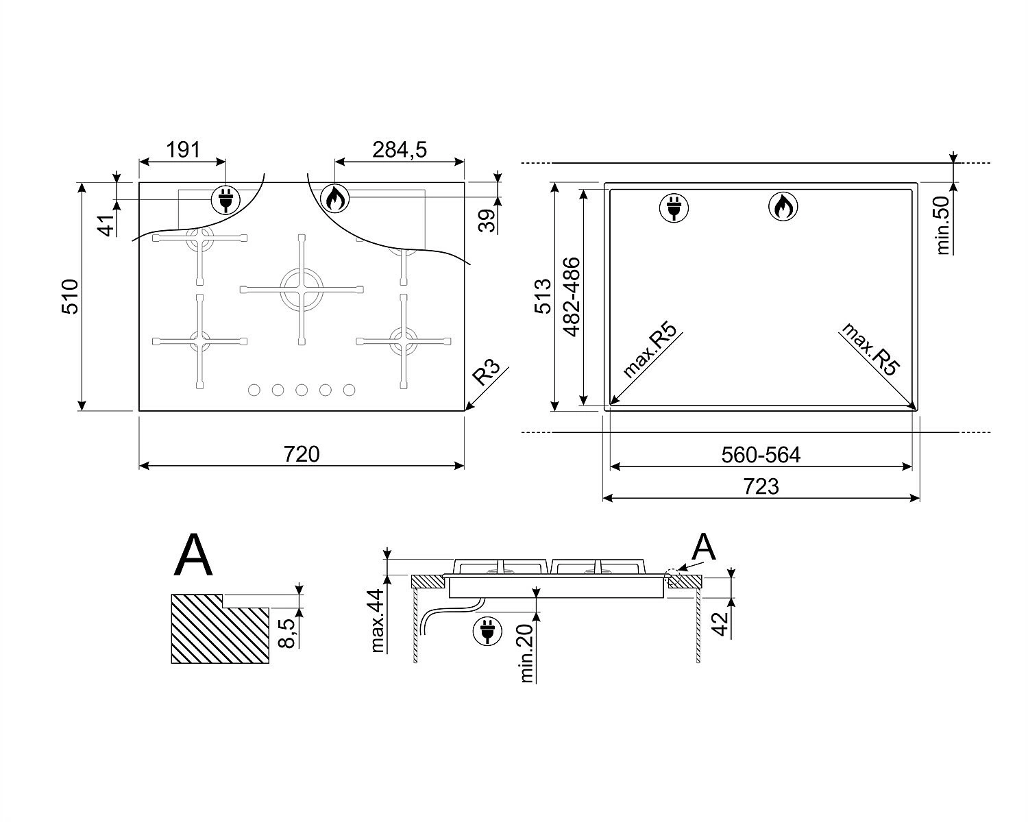 Płyta gazowa, 72 cm, Selezione, czarny PV275B - Smeg