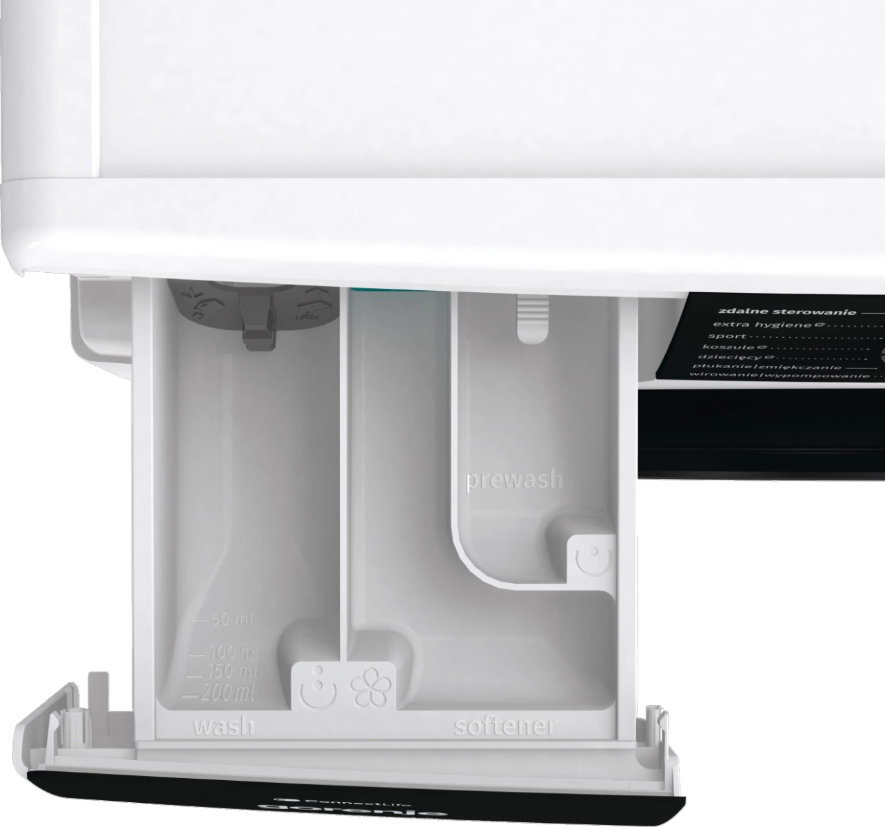- Dozownik na detergenty: 3-częściowy dozownik na detergenty