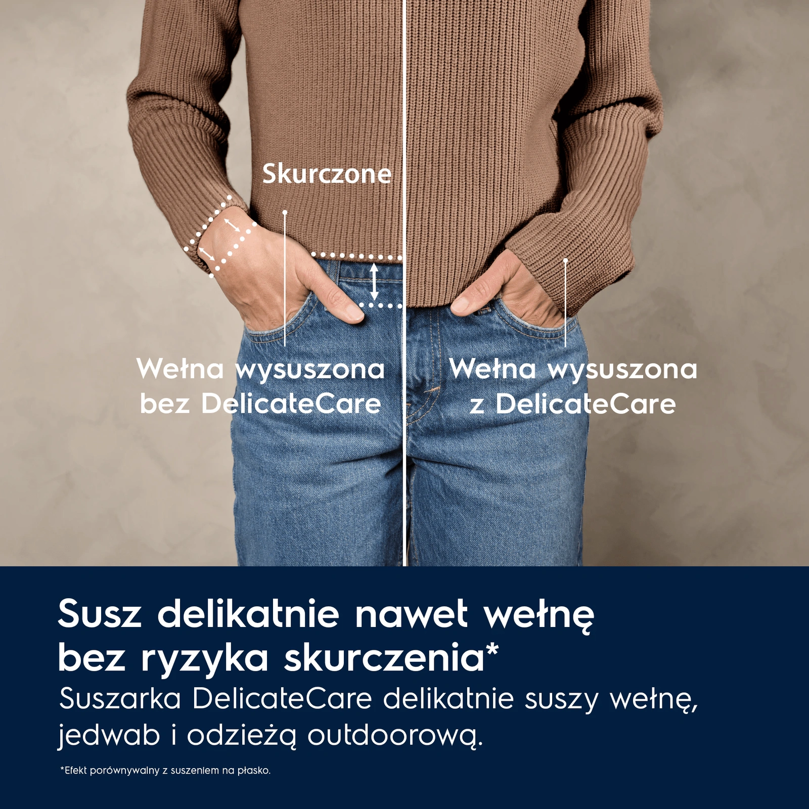 Twoja garderoba zasługuje na więcej niż tylko wysuszenie. Technologia DelicateCare to certyfikowana opieka (Woolmark) nad najwrażliwszymi tkaninami.