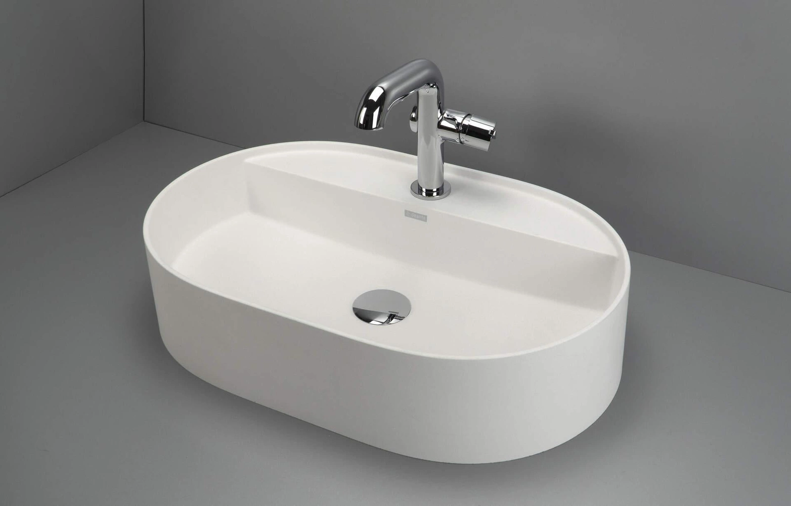 Estetyczna umywalka granitowa stworzona została z kompozytu granitowego o unikalnych właściwościach, które docenią nie tylko miłośnicy natury. Charakteryzuje się odpornością na uderzenia, odbarwienia, wysoką temperaturę i szok termiczny. Specjalna hydrofobowa powłoka ułatwia codzienne sprzątanie. Umywalka nablatowa może być stawiana bezpośrednio na blacie. Bardzo dobrze komponuje się z pulpitami wykonanymi z drewna, kamienia lub stalowymi. Model wyposażony został w specjalnie zaprojektowaną półkę-wyspę z otworem na baterię. Opływowy owalny kształt świetnie współgra z tradycyjnymi i bardziej nowoczesnymi aranżacjami.
