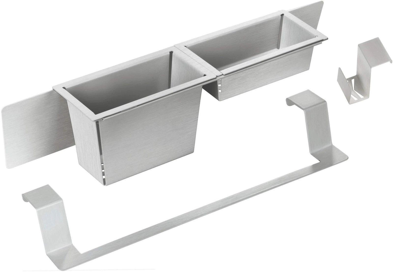 Sprytny zestaw akcesoriów, które przydadzą się w każdej kuchni. Pomagają utrzymać higienę, bo ułatwiają odsączanie gąbki czy sztućców, a co za tym idzie, blokują rozmnażanie bakterii i innych drobnoustrojów. Dodatkowo są bardzo dyskretne i funkcjonalne. Mokra część kuchni jest schludna i panuje w niej nienaganny porządek. Zestaw akcesoriów składa się z 2 koszyków z ociekaczem, haczyka na gąbkę i relingu na ściereczkę. Powstały z wysokiej jakości, szczotkowanej stali nierdzewnej, dlatego bez problemu będą pasować do innych elementów wyposażenia kuchni.