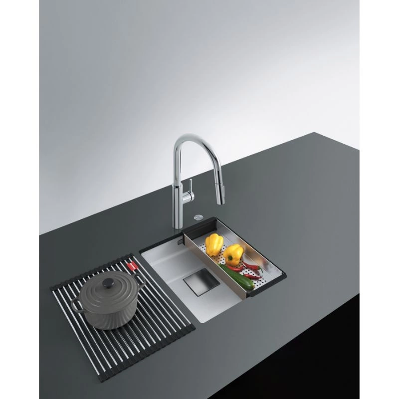 Praktyczny ociekacz idealnie nadaje się do suszenia naczyń i sztućców, a ukryty przelew zapewnia estetyczny wygląd.