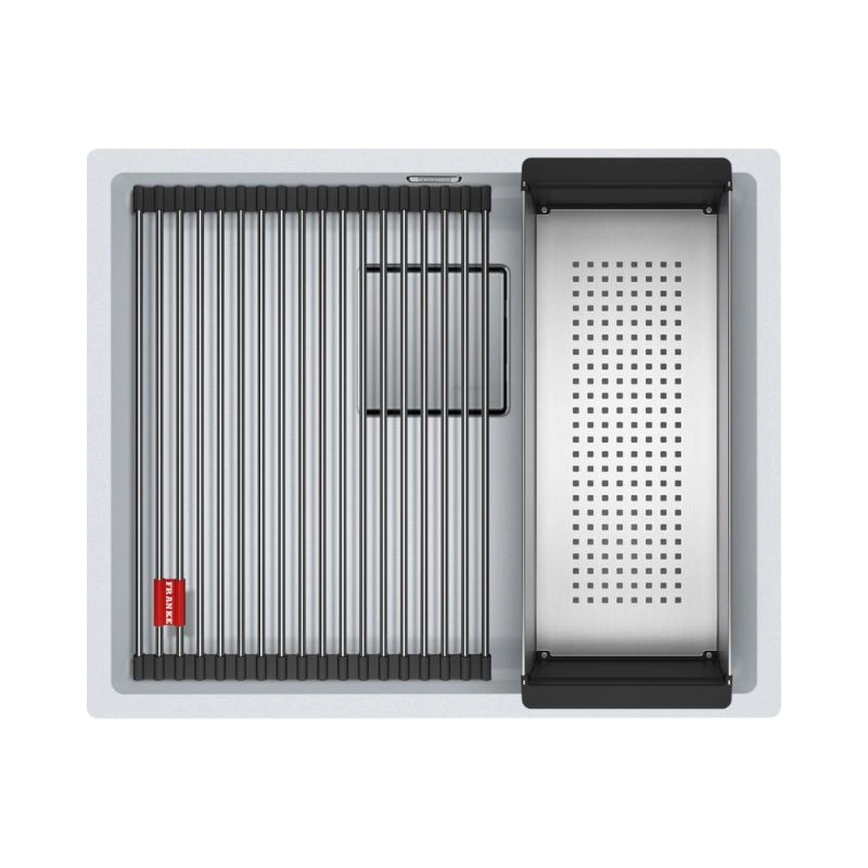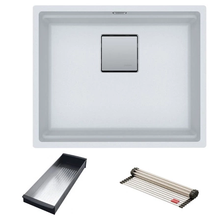 Prezentowany zlewozmywak FRANKE Kanon KNG jest niezwykle trwały i odporny na zarysowania, uderzenia i działanie wysokich temperatur. Gładka powierzchnia zlewozmywaka jest łatwa do czyszczenia, a biały kolor maskuje drobne zabrudzenia i odciski palców, dzięki czemu zlewozmywak zawsze będzie wyglądał nienagannie. Wyprodukowany jest z Fragranitu+, który jest materiałem wyprodukowanym w 80% z naturalnego granitu. Dzięki zastosowaniu bardzo drobnych cząsteczek granitu, uzyskano zlewozmywak idealnie gładki i delikatny w dotyku. Głębokość komory wynosi 20 cm i zapewnia komfortowe użytkowanie i zapobiega rozchlapywaniu wody.