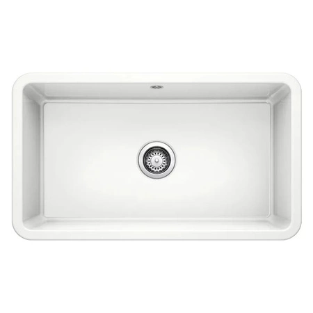 Zlewozmywak wykonany jest z wysokiej jakości ceramiki, która jest odporna na zarysowania, plamy i wysoką temperaturę. Może być bez obaw używany do mycia naczyń, warzyw, owoców czy nawet gotowania. Prezentowany zlew kuchenny Blanco ma jedną, dużą komorę o wymiarach 735 x 400 mm. Dzięki temu jest bardzo pojemny i sprawdzi się w każdej kuchni. Komora jest głęboka na 196 mm, co zapewnia łatwe mycie nawet dużych naczyń. Zlewozmywak wyposażony jest w wylewkę ze stali szlachetnej o długości 270 mm. Wylewka jest obrotowa, dzięki czemu można ją skierować w dowolnym kierunku. Oferowany zlew jednokomorowy można zamontować w szafce o szerokości 80 cm. Montaż możliwy jest zarówno nakładany, jak i podblatowy.