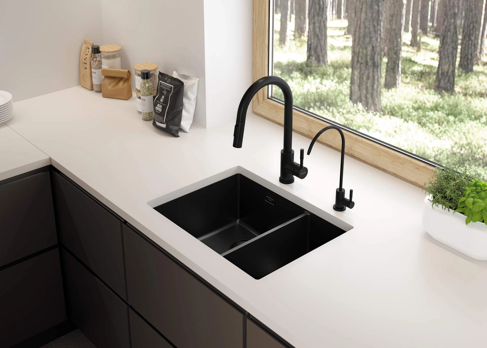 Widoczna część syfonu jest barwiona w masie, przez co jest dużo odporniejsza na uszkodzenia. Uniwersalność matowego koloru czarnego pozwala na dobranie dowolnego wykończenia baterii.