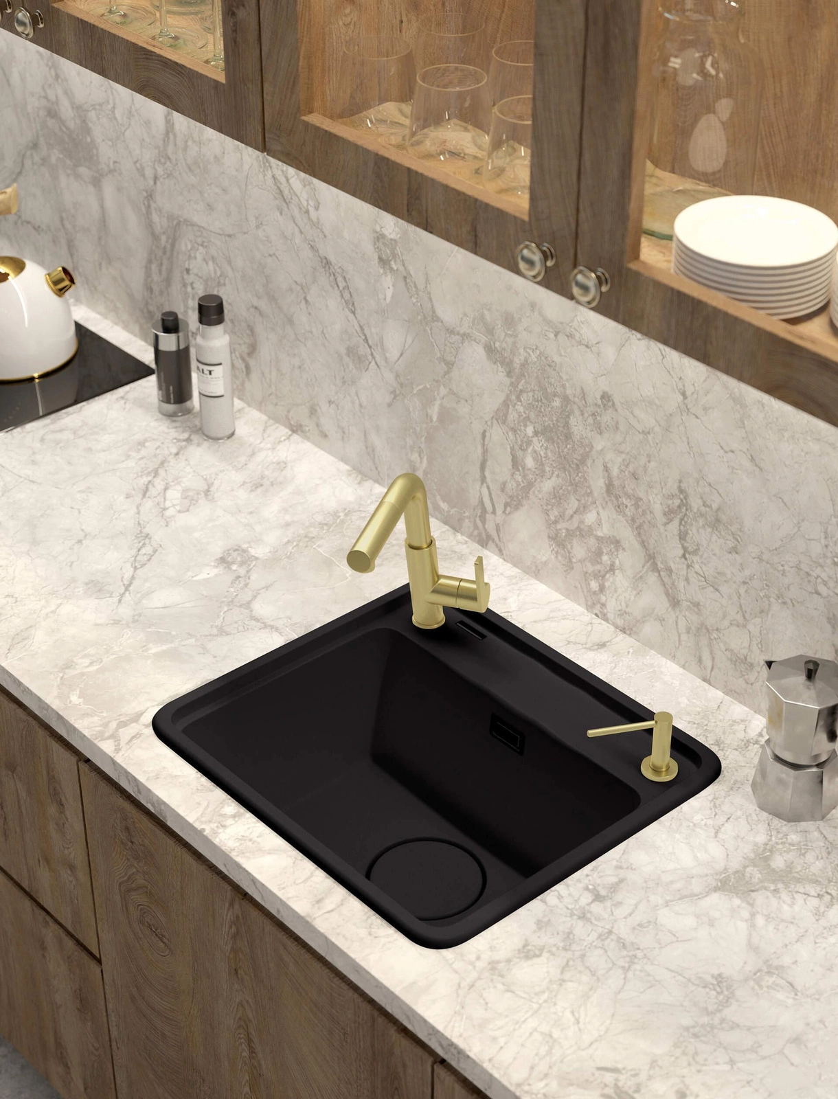 Widoczna część syfonu jest barwiona w masie, przez co jest dużo odporniejsza na uszkodzenia. Uniwersalność matowego koloru czarnego pozwala na dobranie dowolnego wykończenia baterii.