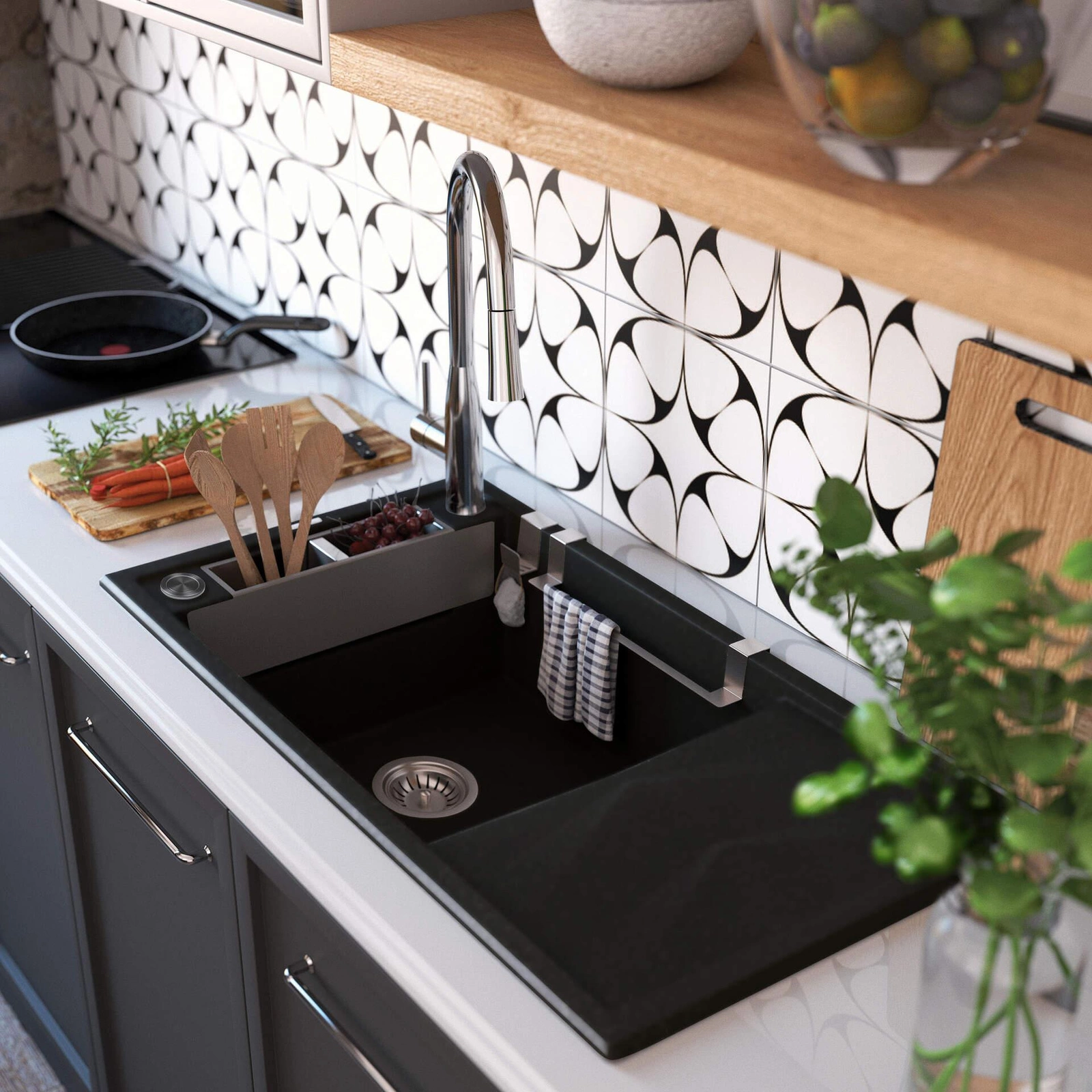 Opcjonalnie zlewozmywak można wyposażyć w koszyki, reling i haczyk ze stali nierdzewnej. Mieszcząc w nich myjkę czy kuchenną ściereczkę i oddzielając je od innych przedmiotów, zwiększasz higienę podczas pracy w kuchni. Koszyki montowane na bocznej półce stanowią praktyczną przestrzeń do przechowywania przyborów kuchennych. Haczyk i reling można również dokupić oddzielnie. Dedykowane zlewozmywakom akcesoria występują w 3 wykończeniach do wyboru: stal szczotkowana, bianco oraz nero.