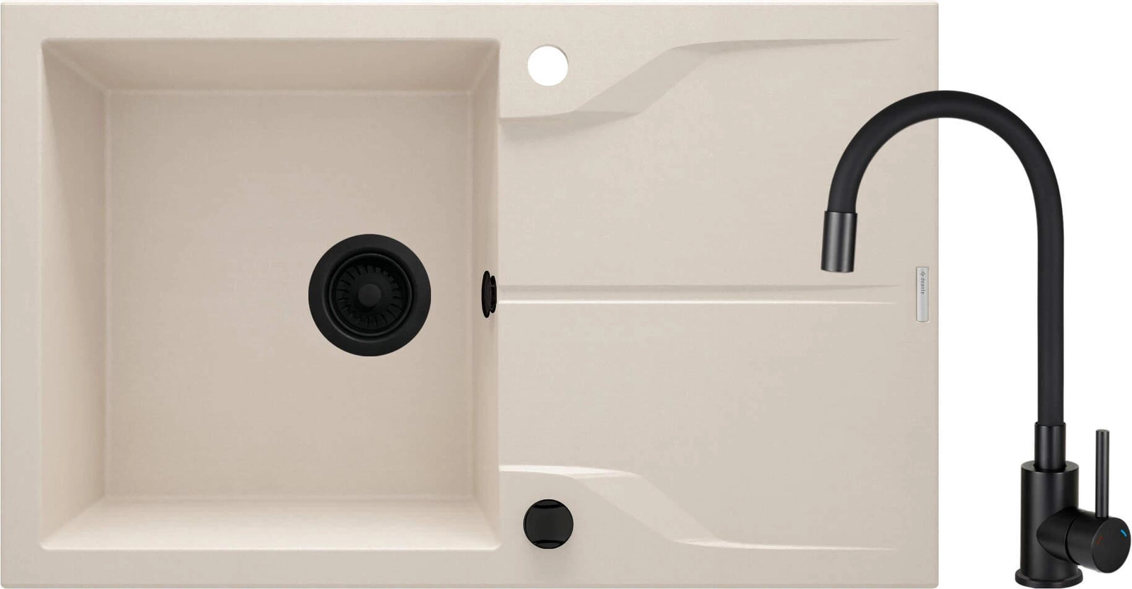Zlewozmywak granitowy z baterią tworzy kompletny zestaw do kuchni. Powstał z wytrzymałego, naturalnego granitu, który jest odporny nie tylko na wysoką temperaturę i jej wahania, ale także na uderzenia i przebarwienia, zgodnie z normą europejską PN-EN 13310. Dodatkowo został wzbogacony warstwą hydrofobową, ułatwiającą spływanie pojedynczych kropel. W tej samej kolorystyce jest też bateria z wygodną wylewką. Praktyczny, 1-komorowy zlewozmywak z ociekaczem to doskonałe rozwiązanie w małych kuchniach i kawalerkach z aneksem. Pełni jednocześnie funkcję suszarki, profilowana powierzchnia sprawnie odprowadza wodę spływającą z naczyń lub umytej żywności.