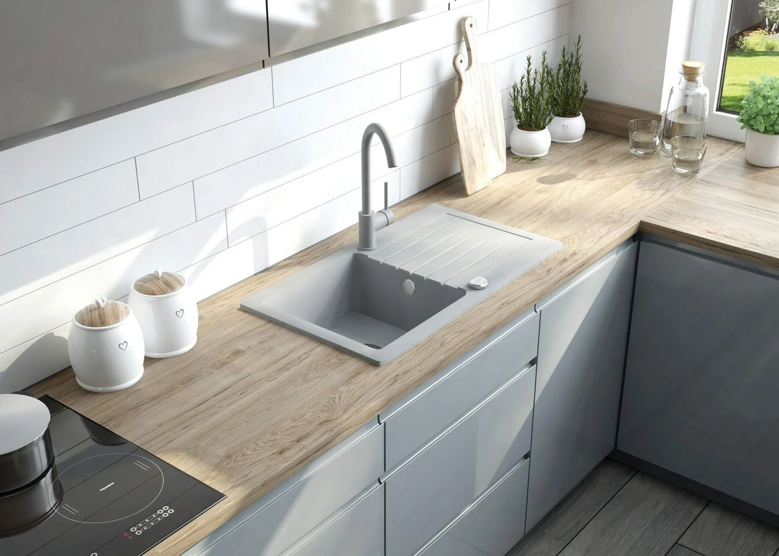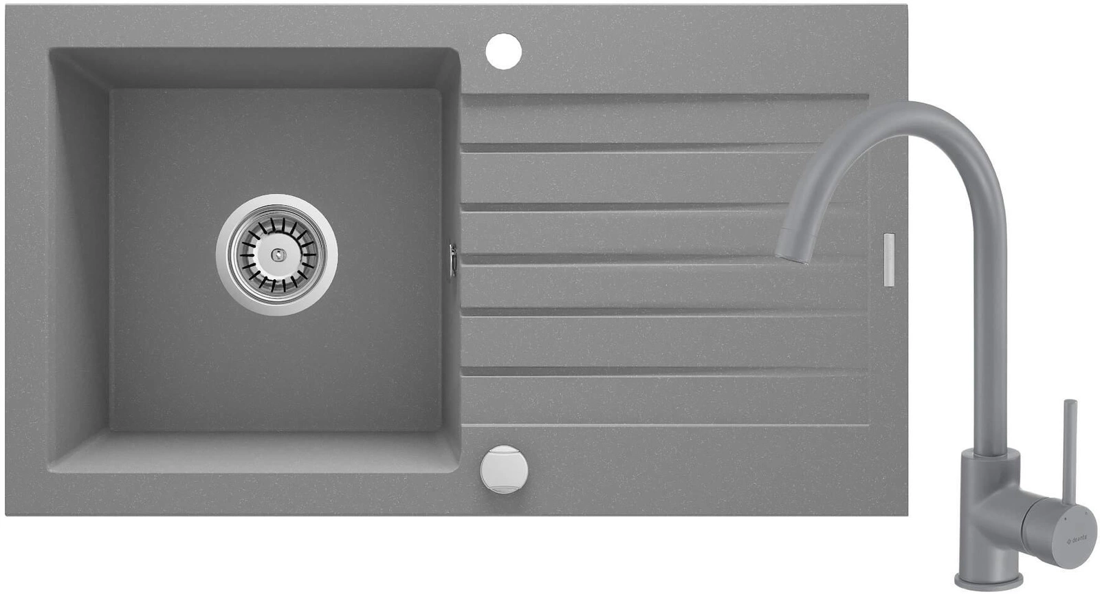 Zlewozmywak granitowy z baterią tworzy kompletny zestaw do kuchni. Powstał z wytrzymałego, naturalnego granitu, który jest odporny nie tylko na wysoką temperaturę i jej wahania, ale także na uderzenia i przebarwienia, zgodnie z normą europejską PN-EN 13310. Ponadto został wzbogacony warstwą hydrofobową, ułatwiającą spływanie pojedynczych kropel. W tej samej kolorystyce jest też bateria z wygodną wylewką. Praktyczny, 1-komorowy zlewozmywak z ociekaczem to doskonałe rozwiązanie w małych kuchniach i kawalerkach z aneksem. Pełni jednocześnie funkcję suszarki, profilowana powierzchnia sprawnie odprowadza wodę spływającą z naczyń lub umytej żywności.