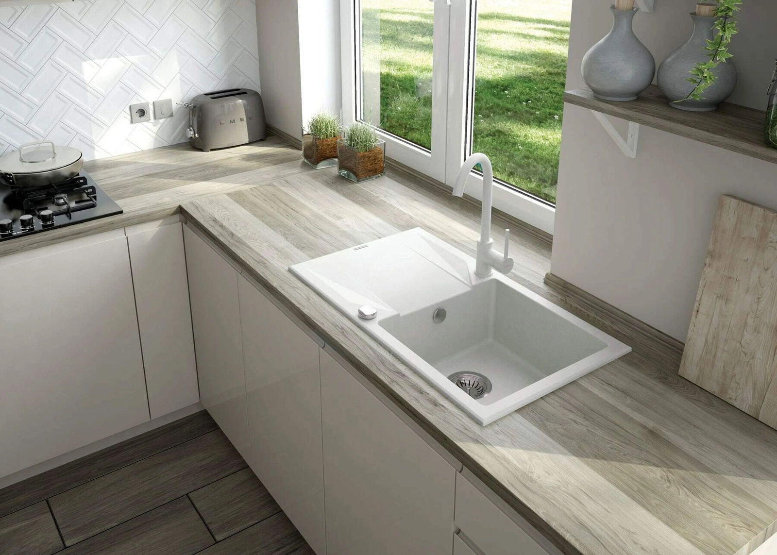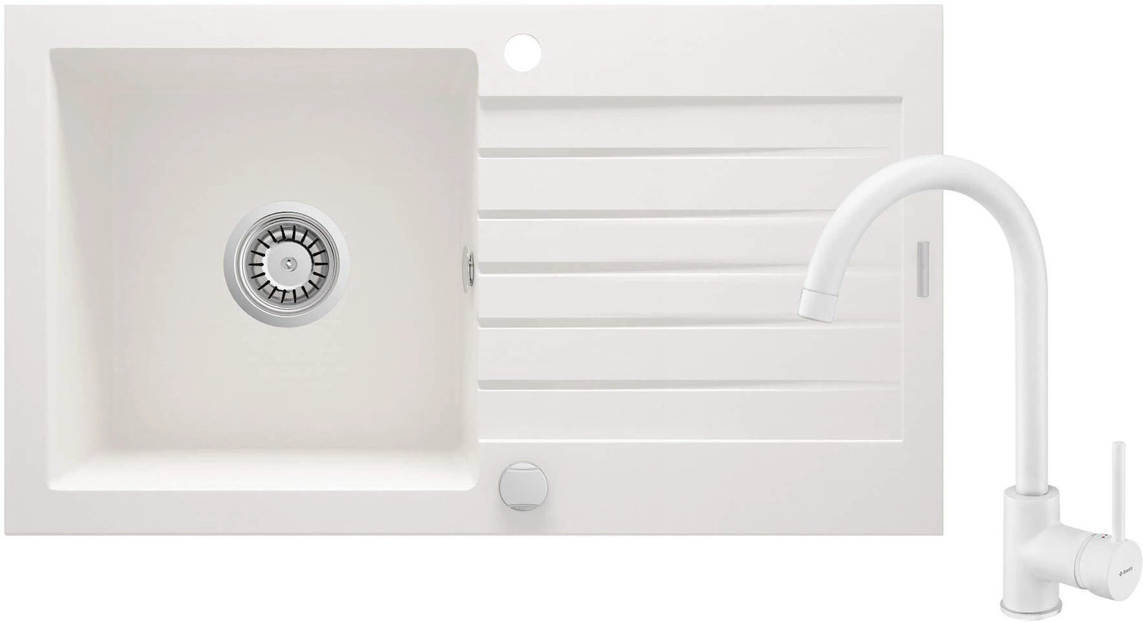 Zlewozmywak granitowy z baterią tworzy kompletny zestaw do kuchni. Powstał z wytrzymałego, naturalnego granitu, który jest odporny nie tylko na wysoką temperaturę i jej wahania, ale także na uderzenia i przebarwienia, zgodnie z normą europejską PN-EN 13310. Dodatkowo został wzbogacony warstwą hydrofobową, ułatwiającą spływanie pojedynczych kropel. W tej samej kolorystyce jest też bateria z wygodną wylewką. Praktyczny, 1-komorowy zlewozmywak z ociekaczem to doskonałe rozwiązanie w małych kuchniach i kawalerkach z aneksem. Pełni jednocześnie funkcję suszarki, profilowana powierzchnia sprawnie odprowadza wodę spływającą z naczyń lub umytej żywności.